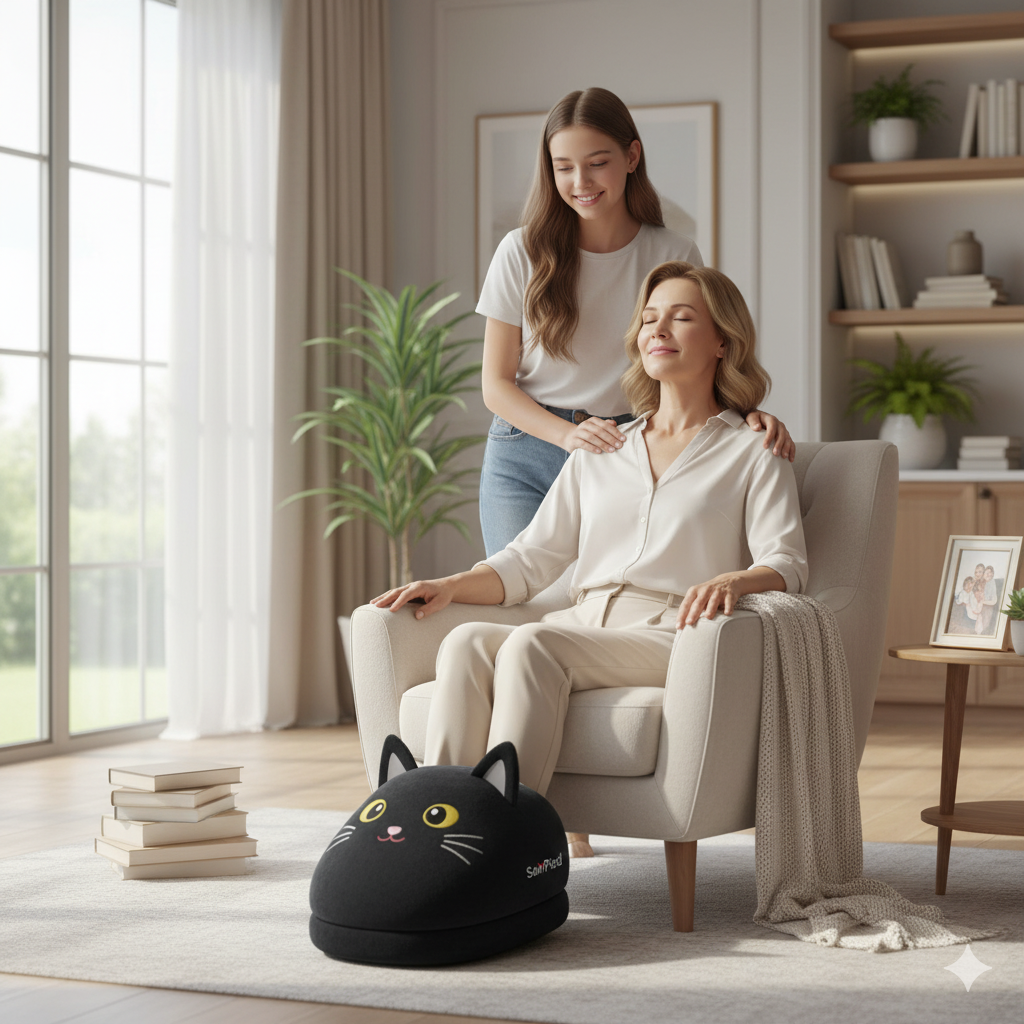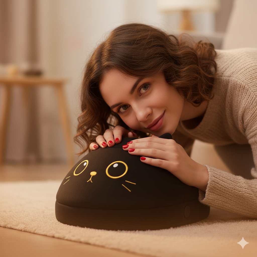Après une longue journée, un rituel tout doux attend au salon : glisser les pieds dans Mewly, le chat masseur qui ronronne de chaleur et de bien-être.